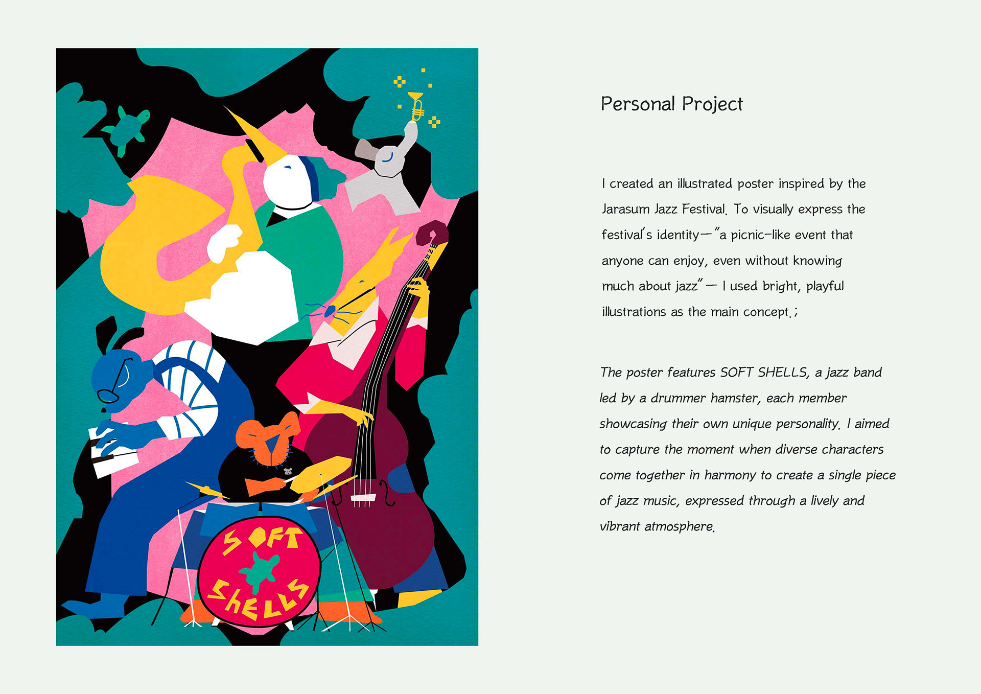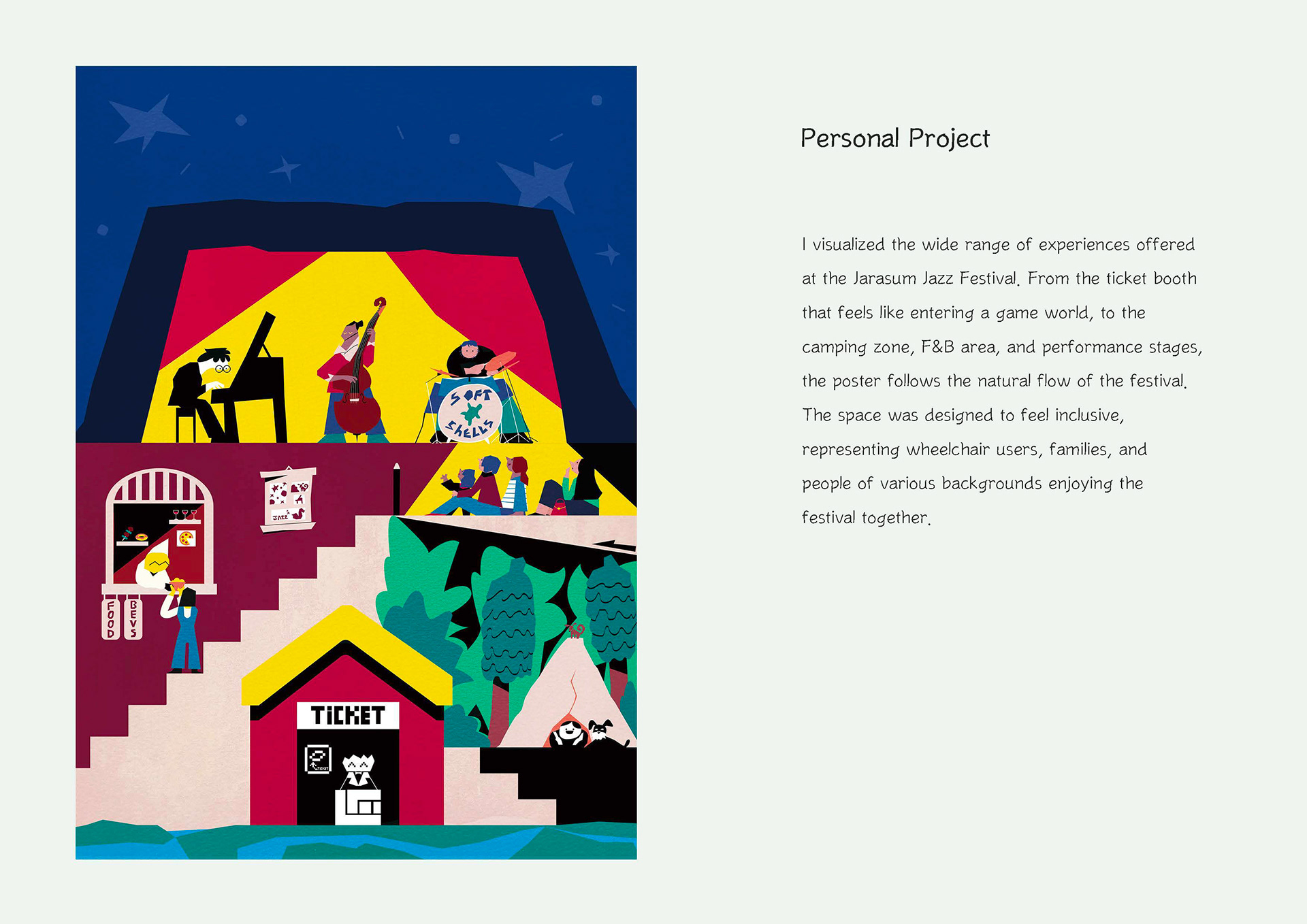I created an illustrated poster inspired by the Jarasum Jazz Festival. To visually express the festival’s identity―“a picnic-like event that anyone can enjoy, even without knowing much about jazz”― I used bright, playful illustrations as the main concept.;